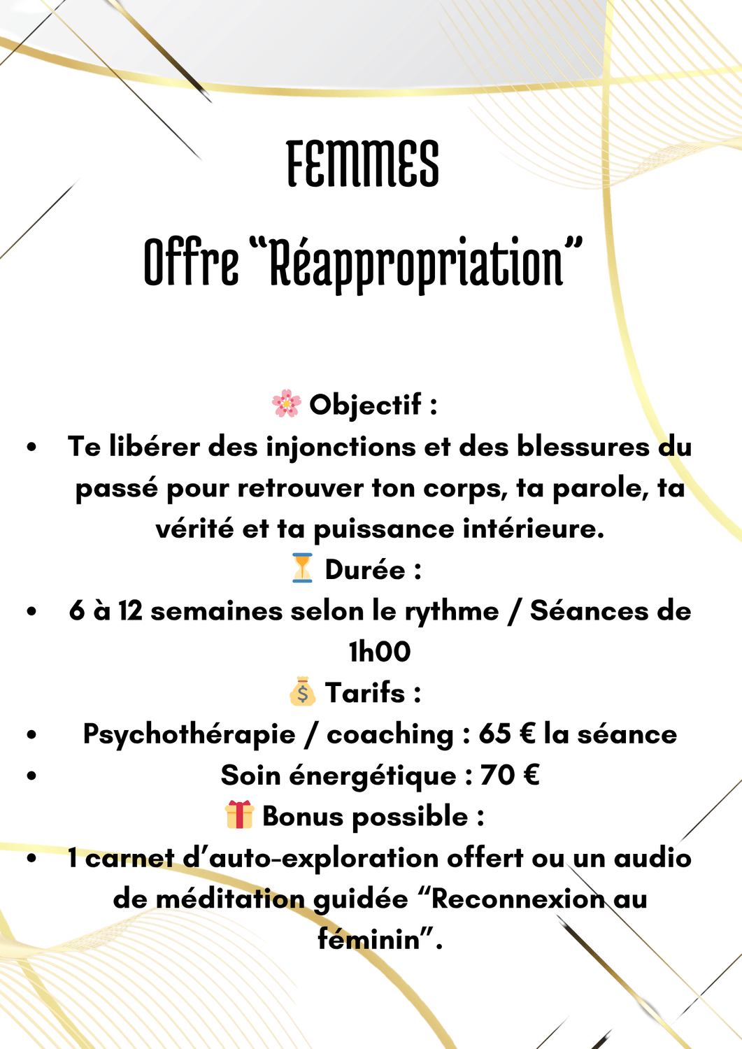 💡 En chemin, on peut explorer ensemble des outils comme la PNL (pour déprogrammer les croyances limitantes), la CNV (pour t’exprimer sans violence), ou des rituels de libération pour marquer symboliquement une étape de ta vie.